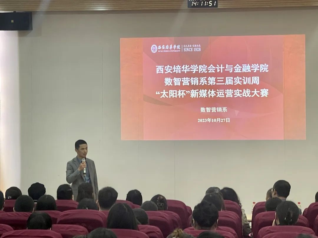 西安培华学院会计与金融学院数智营销系于2023年10月27日周五下午14:00在博远楼J202举办第三届实训周“太阳杯”新媒体运营实战大赛决赛,该活动旨在推动学生在新媒体领域的创新和发展。本次比赛由市场营销专业的王静芝和庞嘉洋同学共同主持。主要参会人员有西安太阳食品有限责任公司董事、行政总监王磊峰,西安太阳食品有限责任公司电商部门相关负责人、西安培华学院会计与金融学院院长赵选民,行政副院长史立军以及副院长丁阳,数智营销系电子商务、市场营销专业全体教师和学生。此次比赛为数智营销系的学生们提供了一个展示他们数字营销技能的舞台,共同见证了这一数字时代的营销盛事。