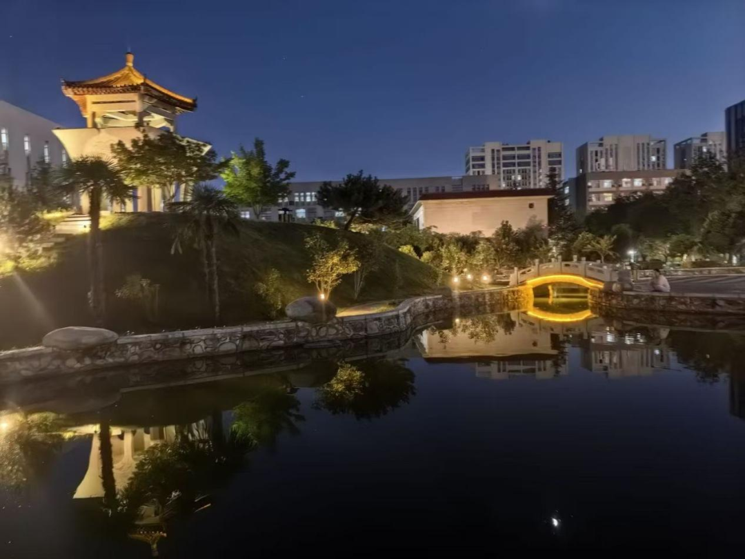天空被夕阳晕染成从橙红到浅黄的渐变色彩,一座金属结构的信号塔矗立在画面中央,成为视觉焦点。远处的建筑与塔吊勾勒出校园周边的轮廓,近处的树木郁郁葱葱,在暮色中形成深绿的剪影。夕阳如一枚红火球,在建筑后方缓缓下沉,给整个校园蒙上了一层温暖而静谧的滤镜,既有校园的青春气息,又有自然日落的诗意浪漫,仿佛时间在此刻静止,满是治愈的氛围感。