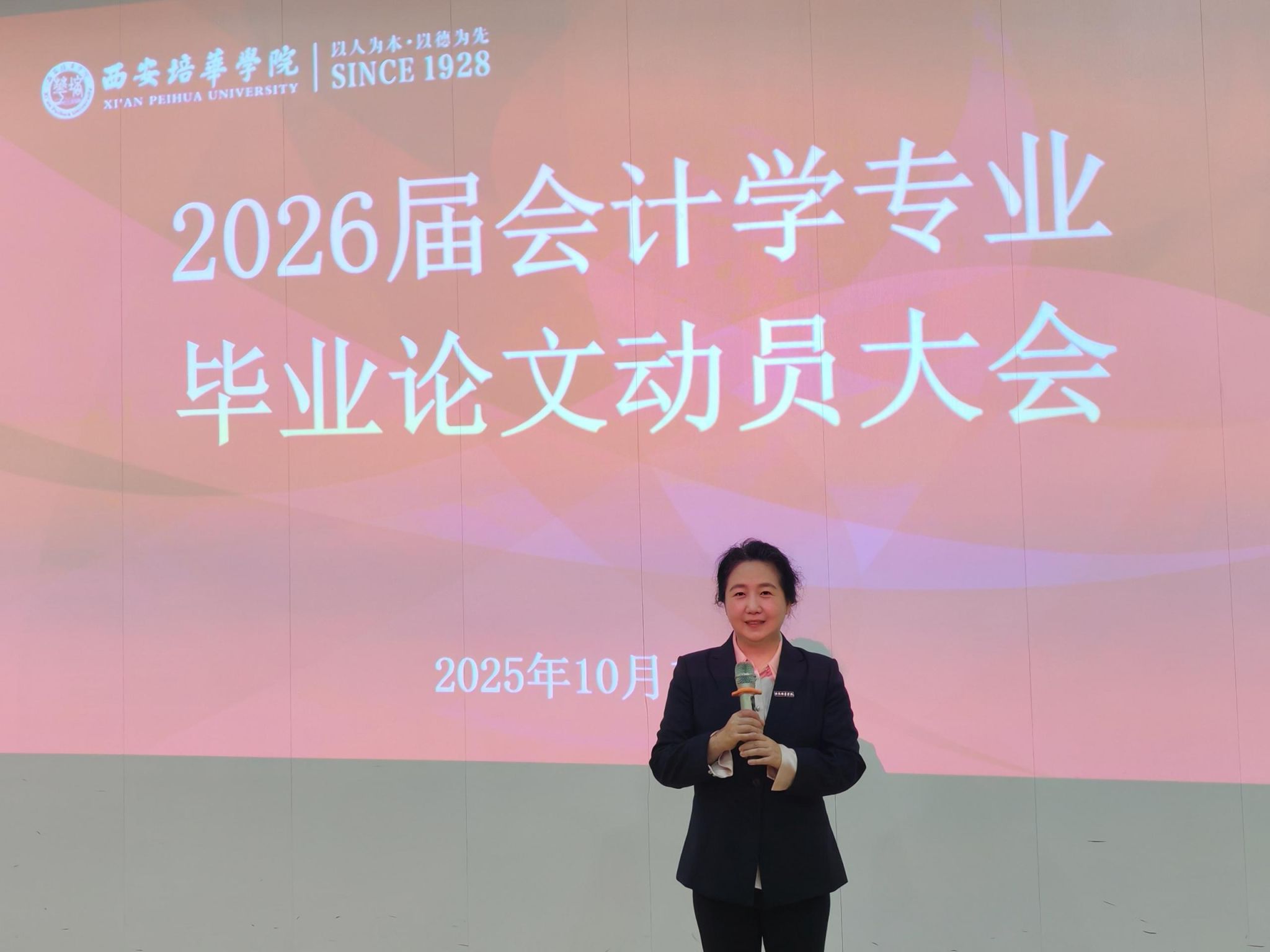 为深入贯彻落实学校审核评估工作要求,紧扣人才培养核心目标,依托国家级一流本科会计学专业建设优势,强化学术规范教育,明确毕业论文全流程要求,帮助2026届本科生平稳开启论文工作,2025年10月16日中午,西安培华学院会计与金融学院会计学系,在博远楼J201教室召开 2026届本科毕业论文动员大会。会议由会计学系主任王小毅教授主持,教学副院长孟君教授、专业带头人王珏教授、全体论文指导老师及2026届本科生参加了此次动员会。