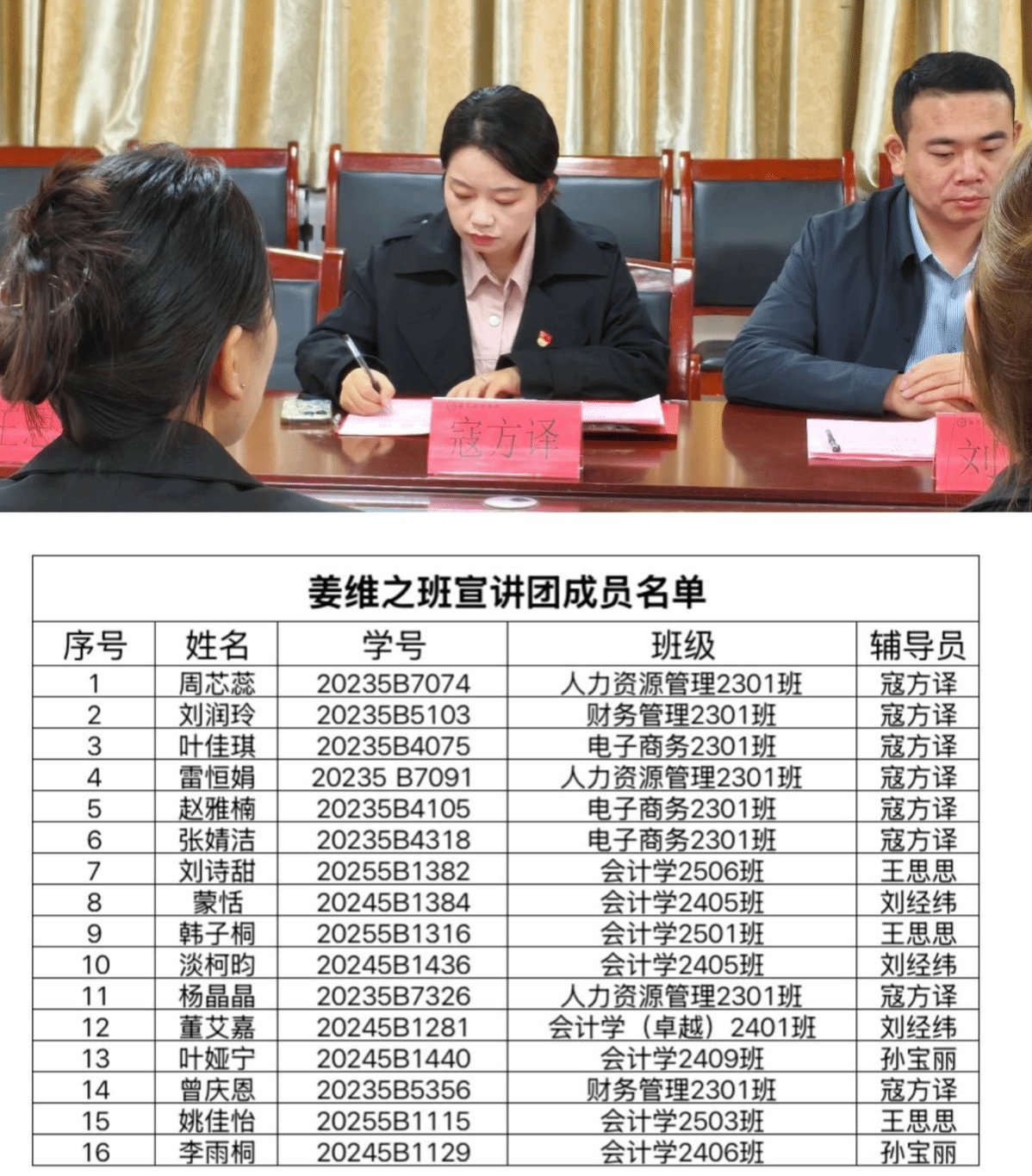 随后,学生干事兼姜维之班宣讲团负责人寇方译宣读《关于聘任2025—2026学年姜维之班宣讲团成员的决定》,周芯蕊同学受聘为宣讲团团长、赵雅楠同学受聘为宣讲团副团长。以下被聘任成员,均通过资格审核、能力评估等环节,充分认可姜维之精神内涵,具备承担宣讲任务的基础素养与责任意识。寇老师对全体成员表达期望,希望他们在后续工作中,严格遵守宣讲团纪律,积极参与宣讲筹备与执行,切实推动姜维之精神的传承与传播,助力学院思想引领与精神建设工作有序开展。