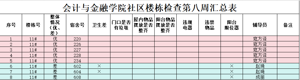 现将本周检查情况反馈如下,本周共走访11号楼学生宿舍75间,其中优秀宿舍5间,占比6.7%;合格宿舍67间,占比89.3%,较差宿舍3间,占比4%。