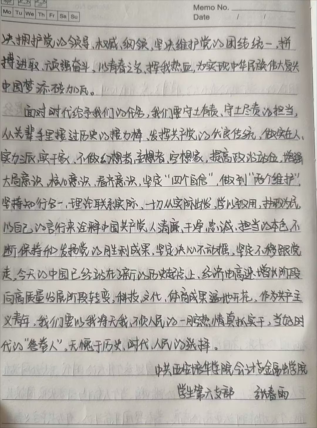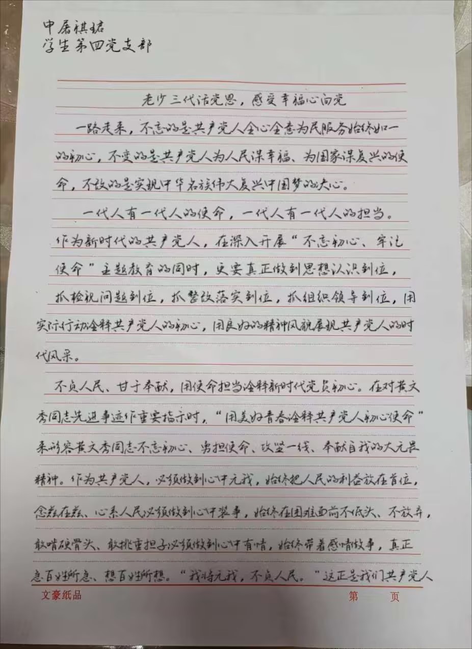 为深入学习贯彻习近平新时代中国特色社会主义思想,激励我院学生党员发扬党的优良传统,传承党的良好精神品质。2023年8月,会计与金融学院党委特举办“老少三代话党恩,感受幸福心向党”主题征文比赛活动,我院各学生党支部成员积极参与。