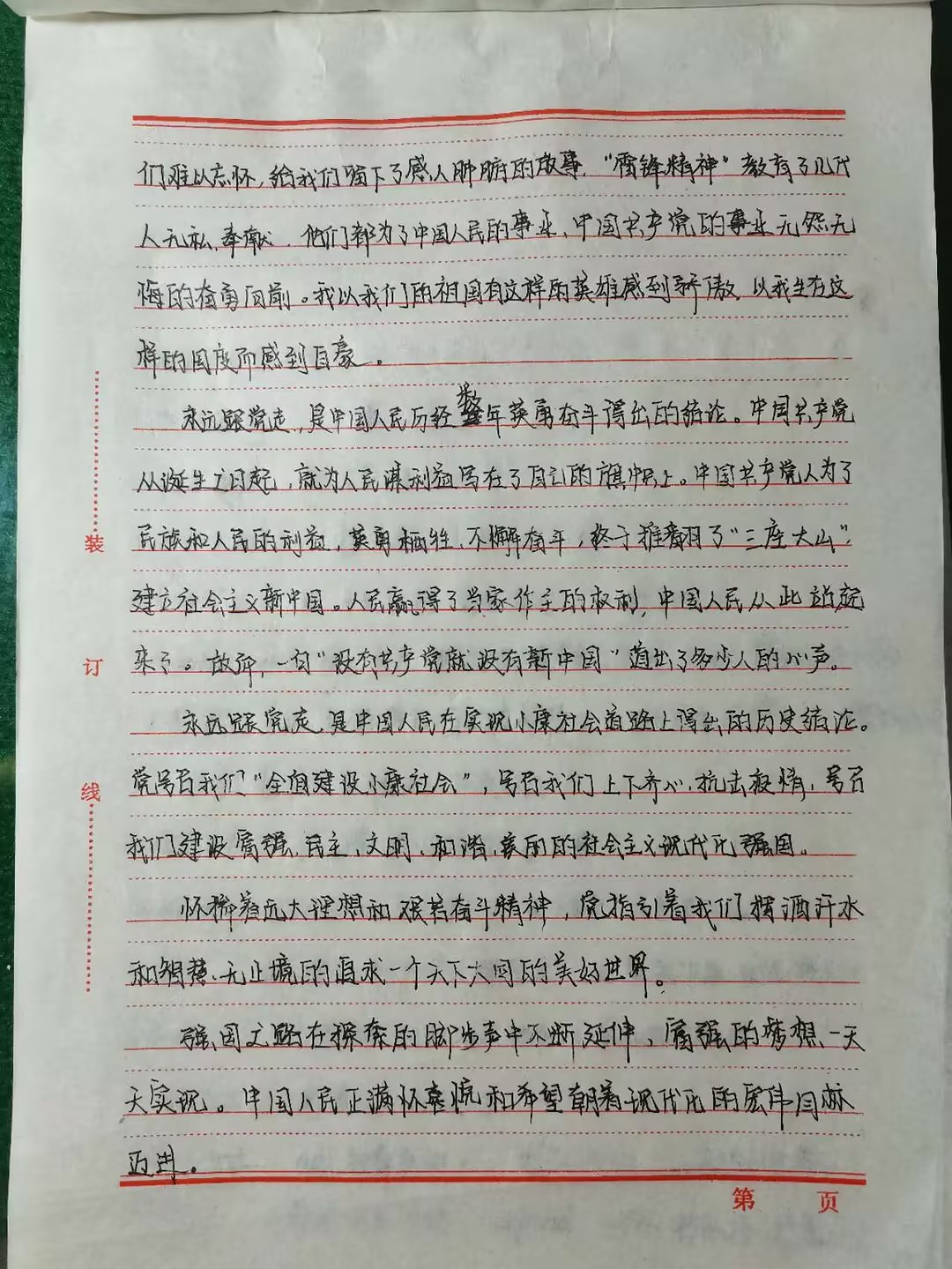 笔下生乾坤,各有千百色,同学们紧紧围绕本次活动主题,笔走龙蛇,一篇篇精彩的文章便跃然纸上,字里行间满是对党和国家的热爱和感激,爱国之情溢于言表。