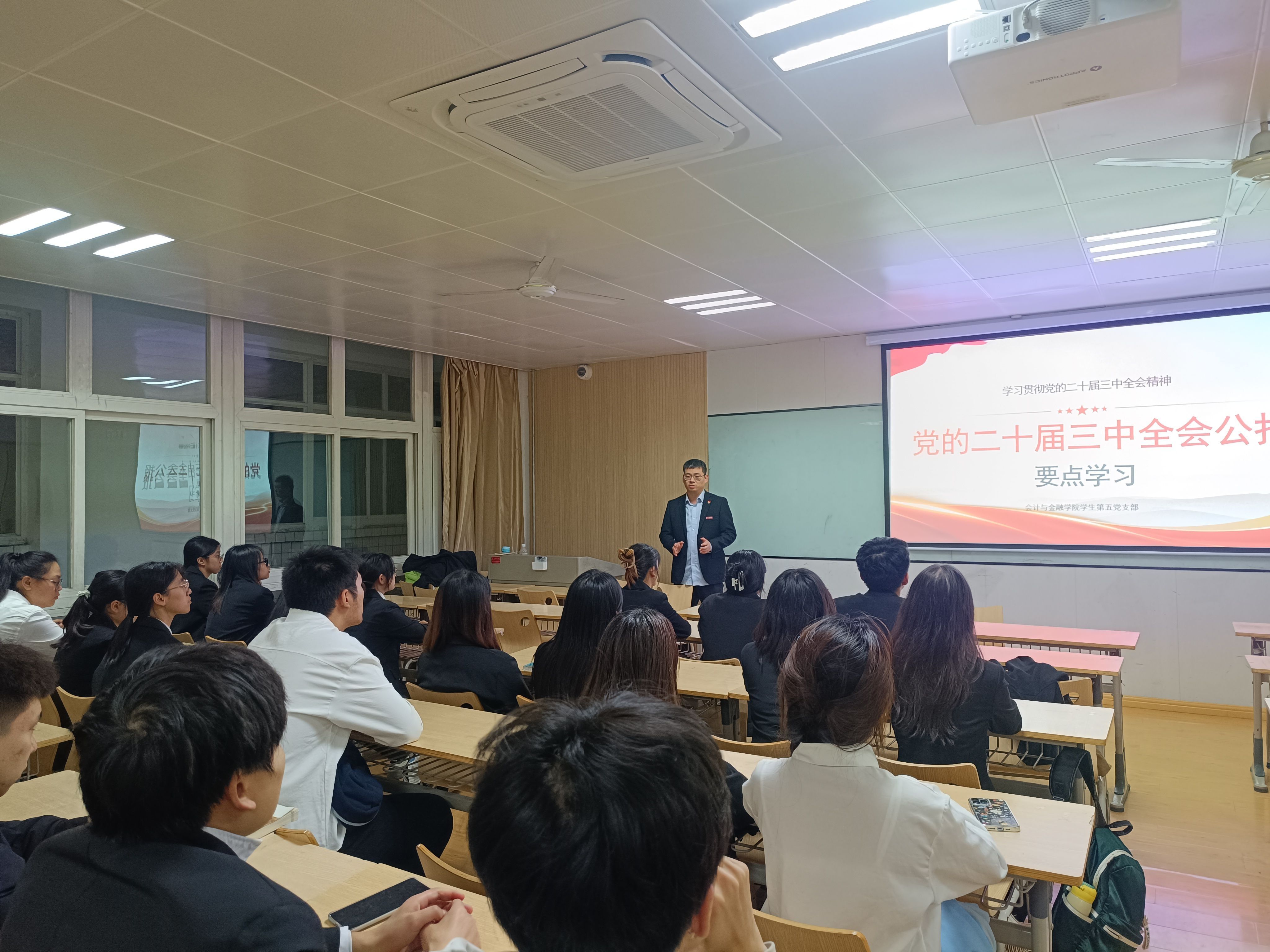 会计与金融学院学生第四党支部开展“学习贯彻党的二十届三中全会”支部书记讲党课活动。支部书记张超老师围绕党的二十届三中全会的情况简介、背景与意义、进一步全面深化改革要求和任务分析等方面阐述。他强调,我们要紧密团结在以习近平同志为核心的党中央周围,坚定信心、锐意进取,为实现中华民族伟大复兴的中国梦不懈奋斗。