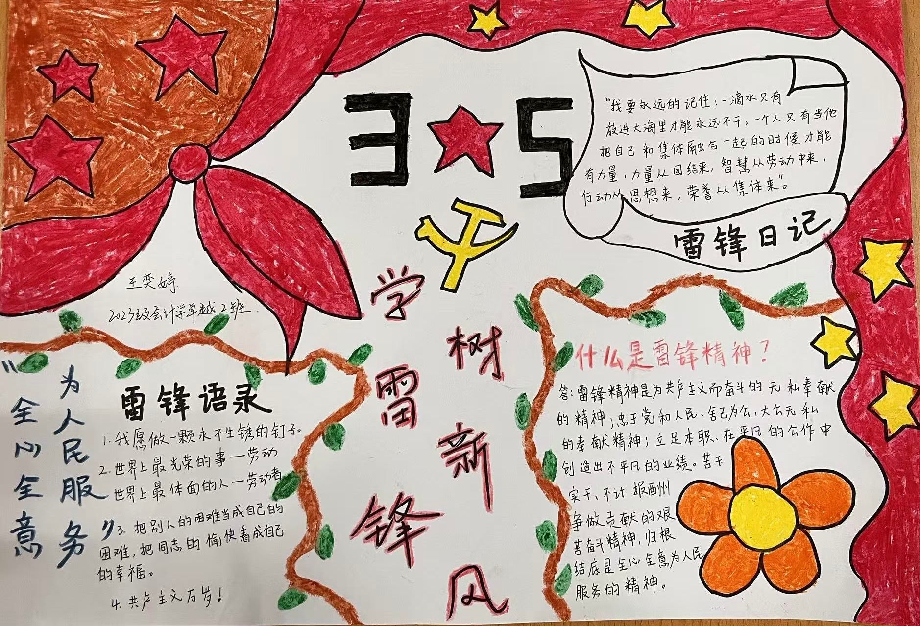 为深入贯彻落实习近平总书记关于弘扬雷锋精神的重要指示,引导广大青年学子传承雷锋精神,培养关爱他人、服务社会的良好品质,会计与金融学院党委于近日举办了以《学习雷锋好榜样,争做时代新青年》为主题的手抄报活动。