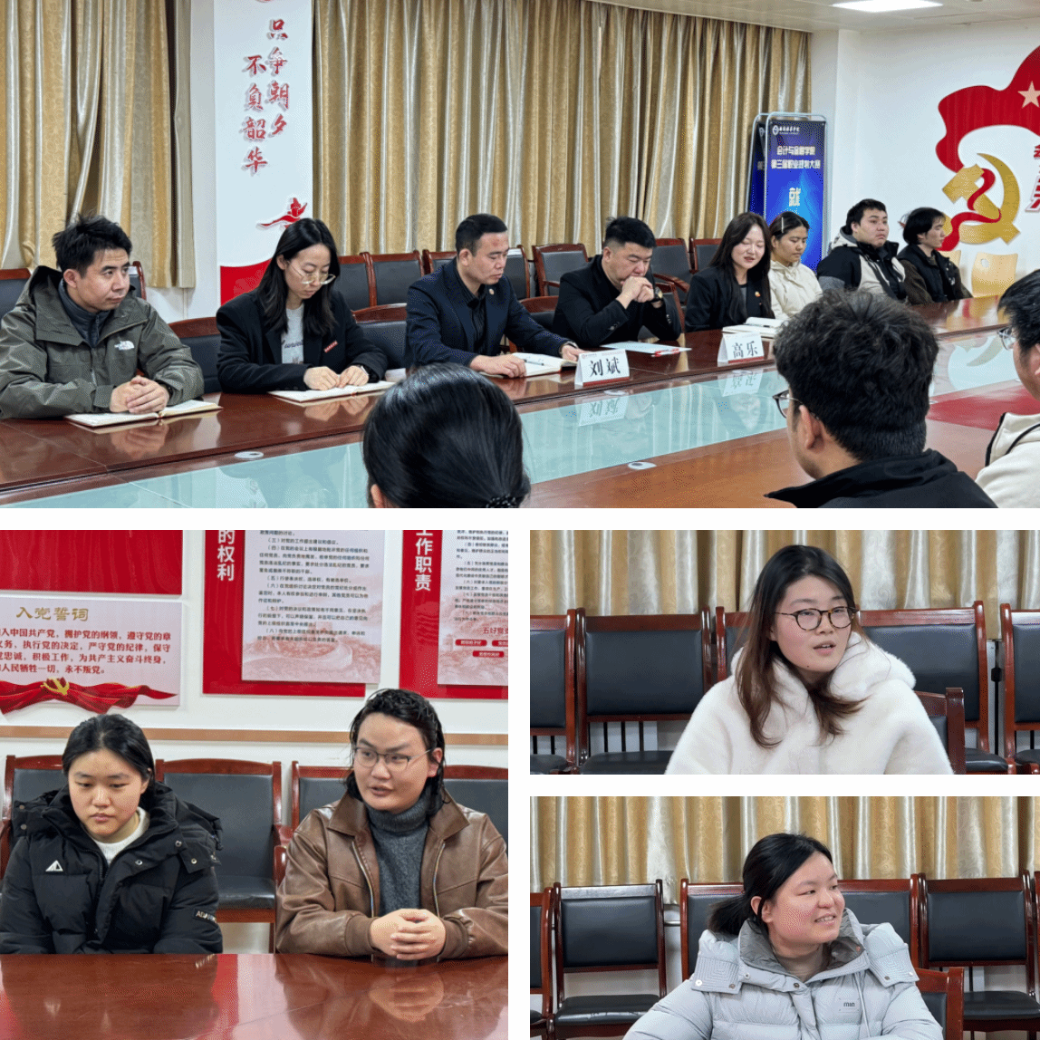 12月15日中午12:10,“无惧风雨,砥砺前行”主题师生座谈会在博远楼2115会议室举行。会计与金融学院党委书记兼行政副院长刘斌、党委副书记高乐、辅导员王苗,以及毕业班全体辅导员与2026届考研学生代表面对面交流,倾听学子心声,共话考研冲刺。