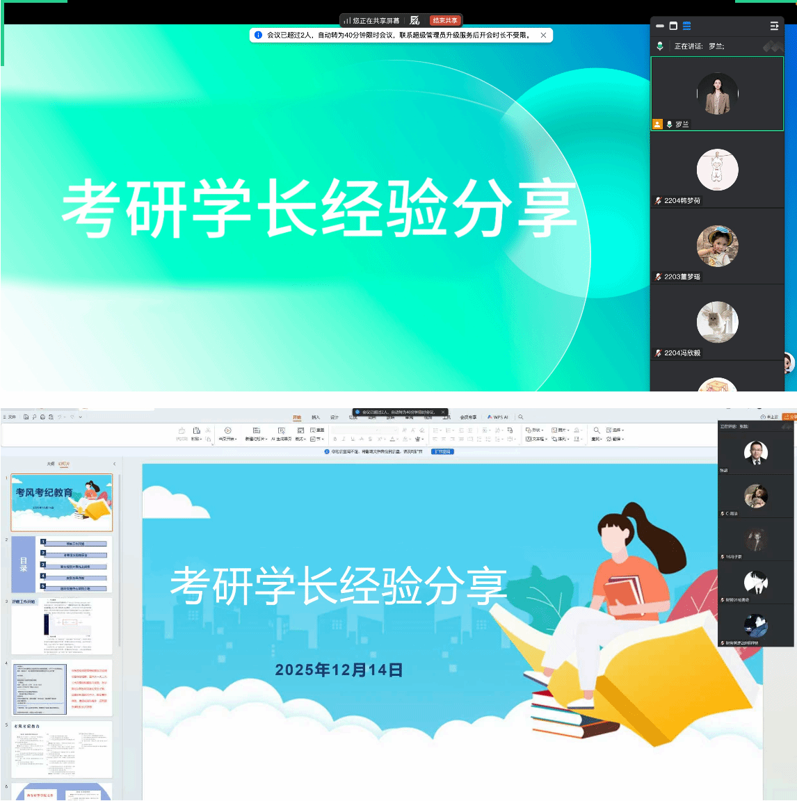 12月14日下午,学院邀请了多名已成功上岸“双一流”高校的优秀学长,通过线上会议的方式,为考研学子带来了一场干货满满的经验分享会。学长们结合自身备考经历,从考前冲刺阶段的复习规划、重难点突破技巧,到考场答题策略、心态调节方法,再到准考证打印、住宿安排、物资准备等细节注意事项,进行了全面细致的讲解。针对同学们普遍关心的“最后阶段如何平衡各科复习时间”“遇到瓶颈期该如何调整”等问题,学长们逐一耐心解答。不少同学表示,学长的分享接地气、有温度,不仅解决了备考中的实际困惑,更让自己感受到了“前辈引路”的温暖,冲刺的方向更加清晰。