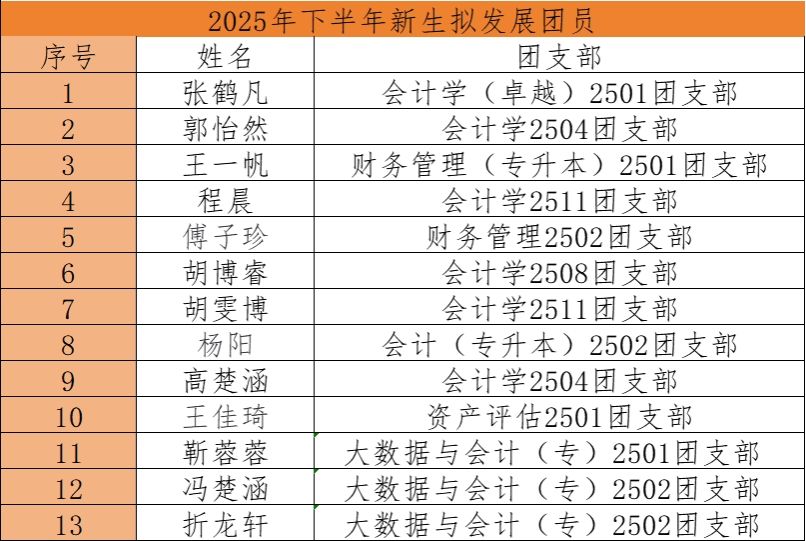 为贯彻落实习近平总书记关于青年工作的重要指示,全面贯彻落实从严治团的重大决策部署,进一步加强我校团组织建设,激发学校青年的政治热情。会计与金融学院团委秉持着从严治团的要求,严格按照《中国共产主义青年团章程》和相关细则,顺利完成了新生拟发展团员评选工作,为团组织注入了新鲜血液,也为学院的团学工作注入了新的活力。现将2025年下半年新生拟发展团员名单予以公示。
