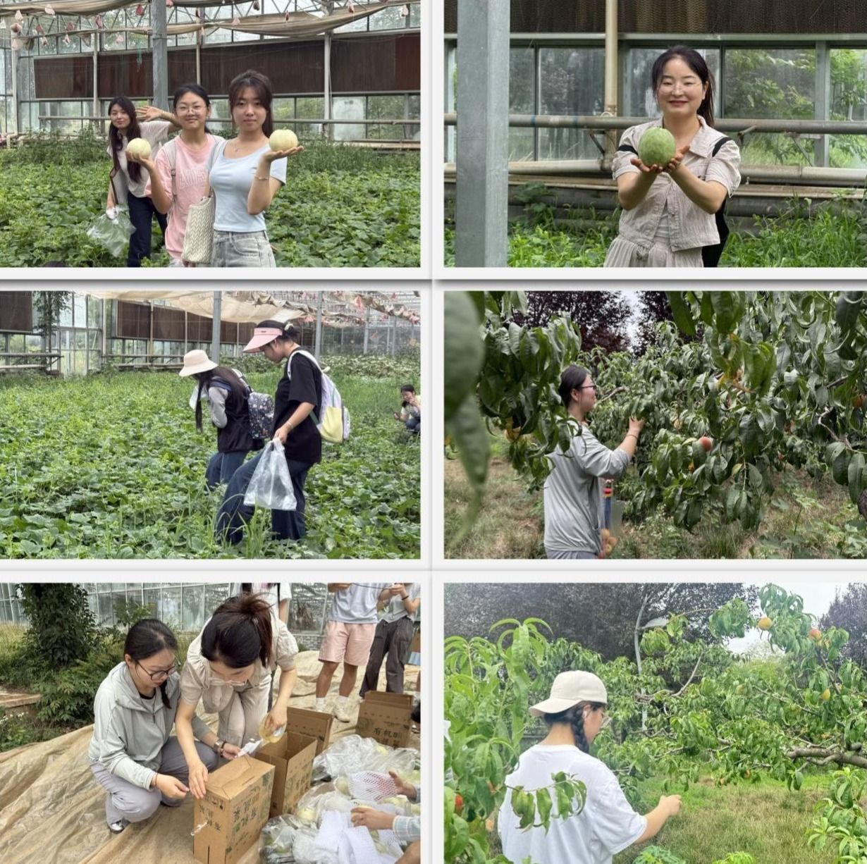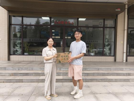 基地内,师生共同劳动的画卷热烈铺展。面对曾经亲手栽下的秧苗如今已果实累累,学生们眼中闪烁着成就的光芒。在老师指导下,他们俯身垄间,小心翼翼地摘下饱满的番茄、翠绿的黄瓜、沉甸甸的茄子、鲜亮的辣椒、清香袭人的甜瓜和粉红诱人的桃子。每一捧沾着泥土的果实,都凝结着数月来定期管护的心血,无声印证着“一分耕耘,一分收获”的朴素真理。师生协作,采摘、分拣、装箱,有条不紊,汗水浸透衣衫,笑容却始终绽放——基地最终统计收获各类蔬菜瓜果近百余斤,这是劳动最直观、最甘甜的回报。孙宝丽老师作为学院代表向学生赠送蔬果礼盒。
