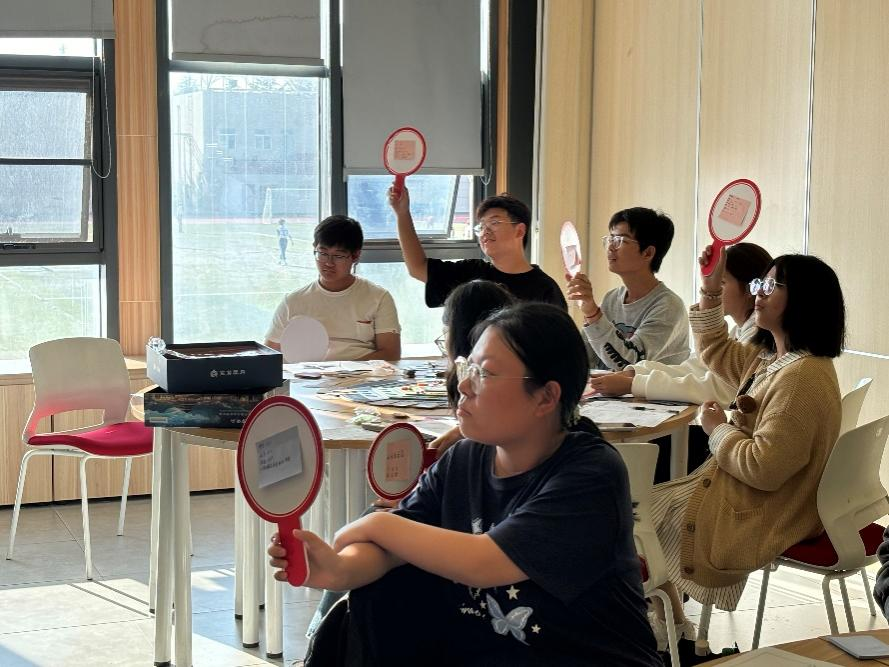 活动伊始,同学们按要求分组、自我介绍,起好组名之后便开始了此次穿越之旅。江老师介绍了沙盘中各个道具的使用方法,每位同学在选择自己的“修行角色”后沙盘体验正式开始。整个活动分为四个部分:初探学府、渐入佳境、深造精进和登峰造极。同学们根据江老师的讲解开始了一轮轮“策行令”的任务,有人果断执行,有人选择观望,每一步都像现实中的决策一样,牵动着“未来”的走向。每轮体验结束,江洁老师都会邀请同学们分享体验感受,让此次活动不仅是“玩”,更是“想”。