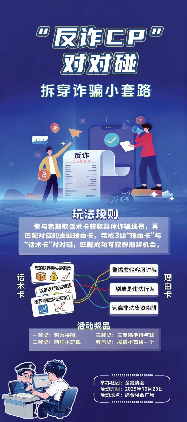 金融协会打造沉浸式趣味反诈局!抽卡配对开启“话术卡+理由卡”挑战,在互动中层层拆解诈骗套路,轻松从“反诈小白”进阶“识骗达人”,守护财产安全不踩坑。