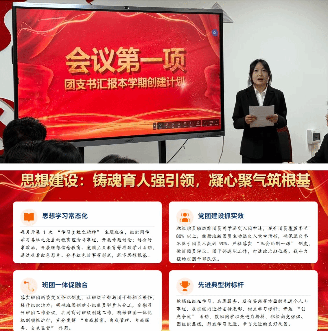 会上,2023电子商务01班团支书张婧洁从思想铸魂、学风筑基、实践赋能、管理提质四个维度,系统汇报班级年度工作计划与发展目标。