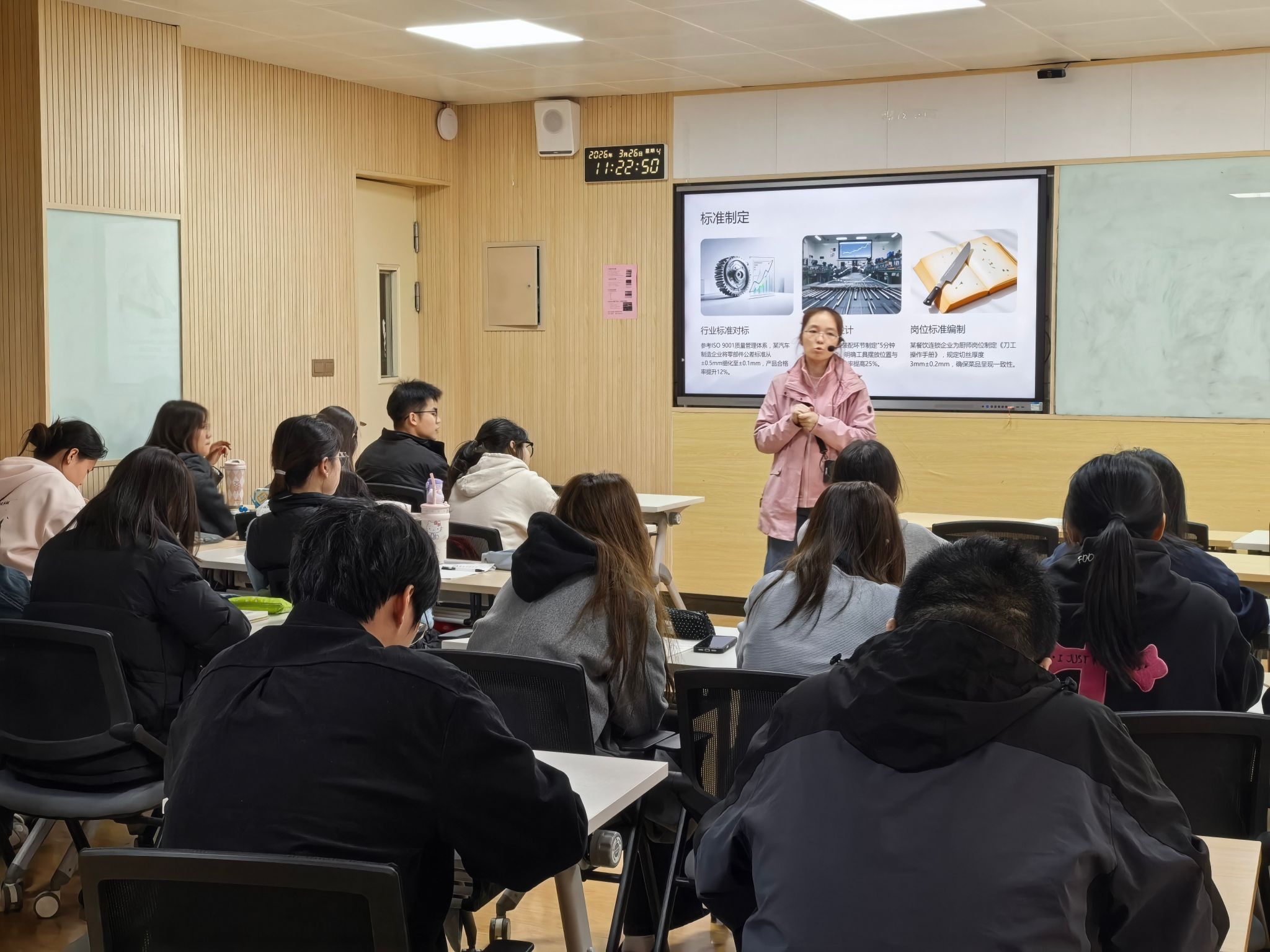 张婉金老师主讲的《标准化体系与法规》课程,则把教学重点放在“标准体系构建+法规合规执行+实操落地”上。课堂中,张老师围绕标准化的理论、制度、流程与实践展开系统讲解,带领学生从“为什么要标准化”出发,一步步走进“标准体系怎么建、法规要求怎么看、企业工作怎么落”的现实场景。课程坚持以学生为中心、以项目为驱动,结合企业管理实例,让学生在案例分析、任务研讨和课堂互动中,深入理解标准化工作、合规管理与质量提升之间的紧密联系。对学生来说,这门课学到的不只是概念,更是一种未来进入职场后能够直接使用的思维方式和工作方法。