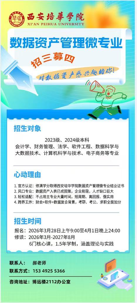 当数据成为新的 “石油”,当数据资产入表成为国家战略,企业对数据资产管理人才的需求正迎来爆发式增长。西安培华学院会计与金融学院数据资产管理微专业全新招生,为有志于深耕数字经济的你,量身打造一条低门槛、高回报的成长快车道!