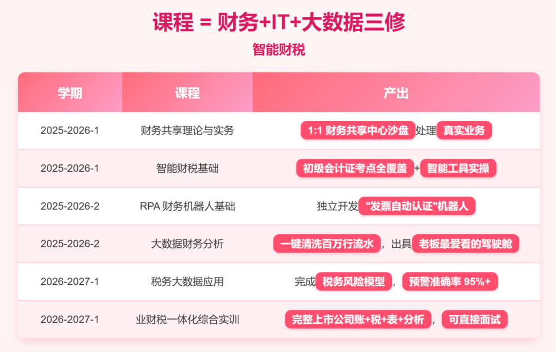 低成本高回报:不收费,拿“税务师 + 数据师”双证,3学期解锁新赛道 + 名企通道,16学分,256学时线上+线下灵活授课。