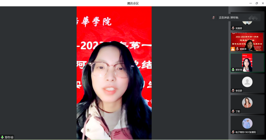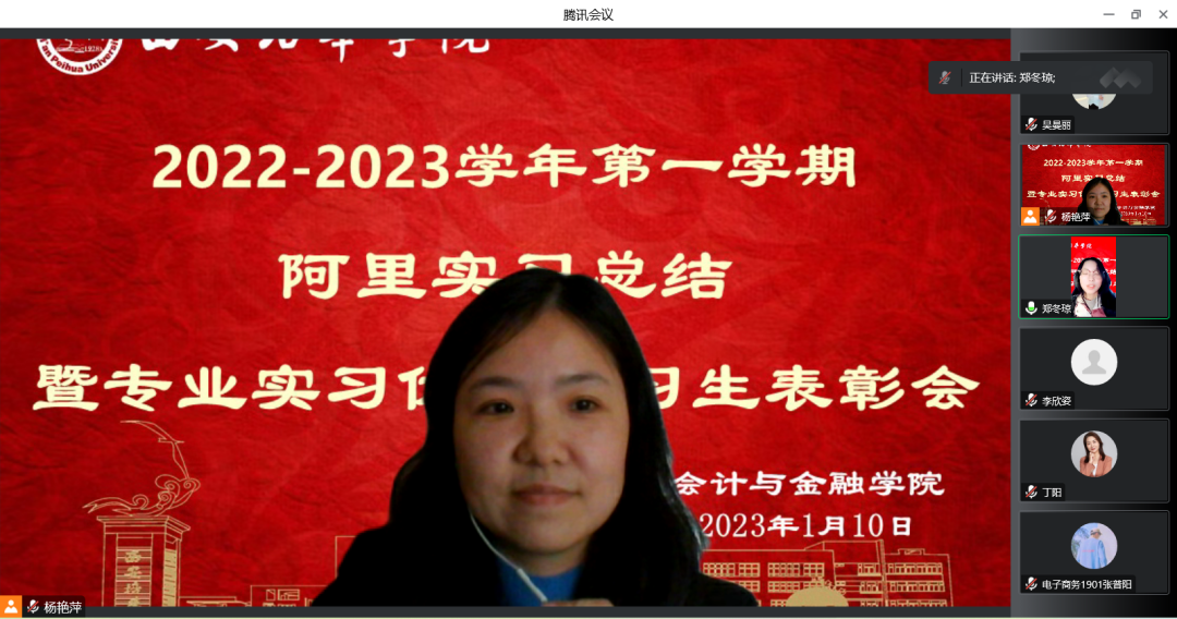 会计与金融学院数智营销系、经济系师生于2023年1月10日下午16时于腾讯会议召开阿里项目实习总结暨专业实习优秀实习生表彰会,会议由市场营销专业杨艳萍老师主持,与会邀请了产学研副院长丁阳教授、数智系主任李亚子教授,副主任刘茹岚老师、市场营销、电子商务、金融工程及国际贸易专业实习负责老师,参与本次实习的其他指导老师及全体学生。