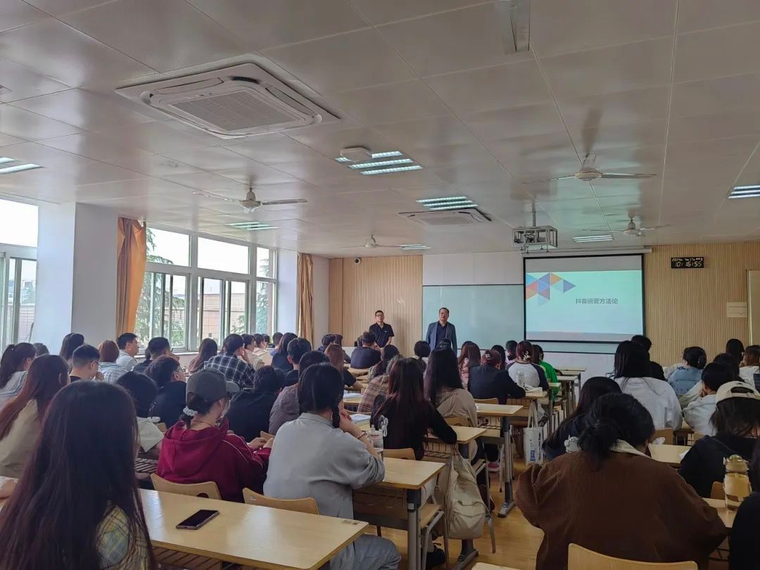 2024年4月17日上午10点,博远楼2312教室内座无虚席,数智营销系主任李亚子、市场营销学科带头人杨柏欢、学生素质发展中心副主任樊晓军与电子商务、市场营销专业的学生们共同聆听了由深圳市酒海实业有限公司运营总监朱贵政先生带来的一场关于抖音电商运营的精彩讲座。
