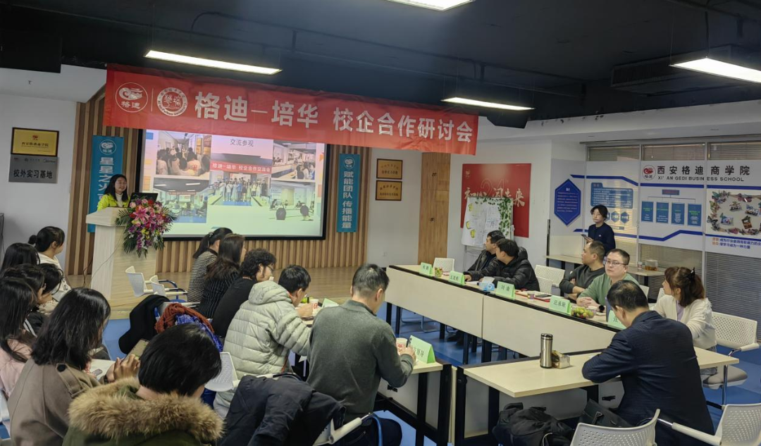 校领导一行首先参观了西安格迪企业管理有限公司企业文化墙和办公外部环境,了解企业的发展历程和组织构架。随后进行师生座谈会,会议按照领导致辞、实习生汇报、实习生座谈和企业导师代表发言四部分进行。在领导致辞中,胡校长从学校的办学定位入手谈及学生校外实践的重要性,对当前学生专业能力如何适应行业就业环境提出若干建议,同时对企业提供给学生实习机会并培养其实践技能表示了诚挚的感谢。
