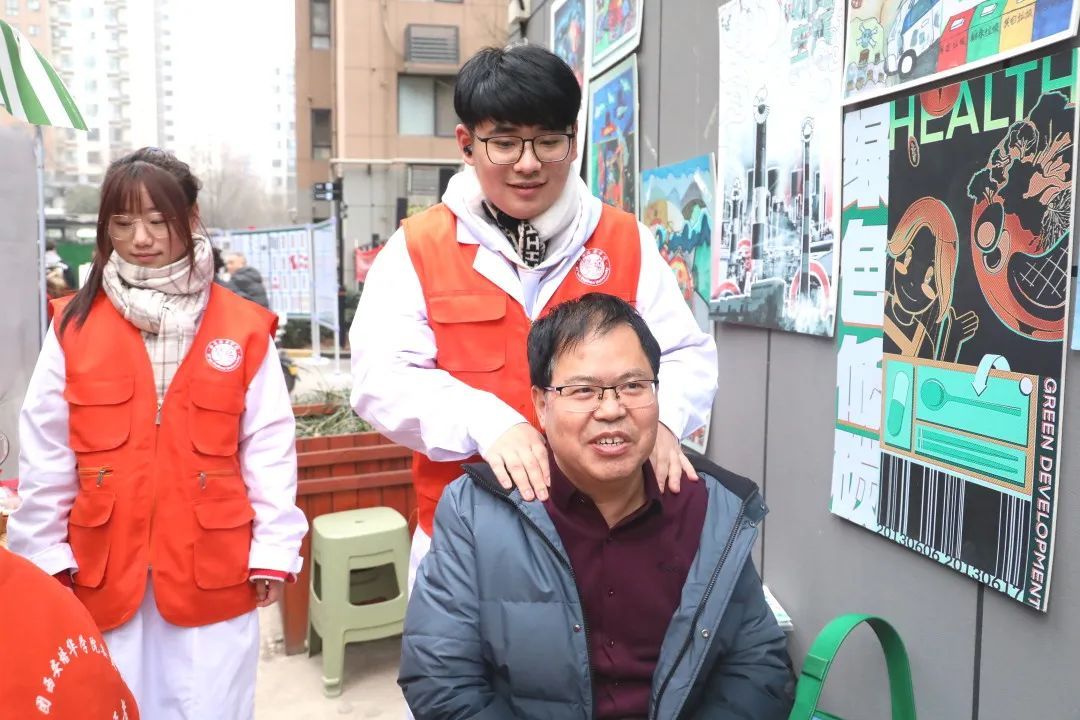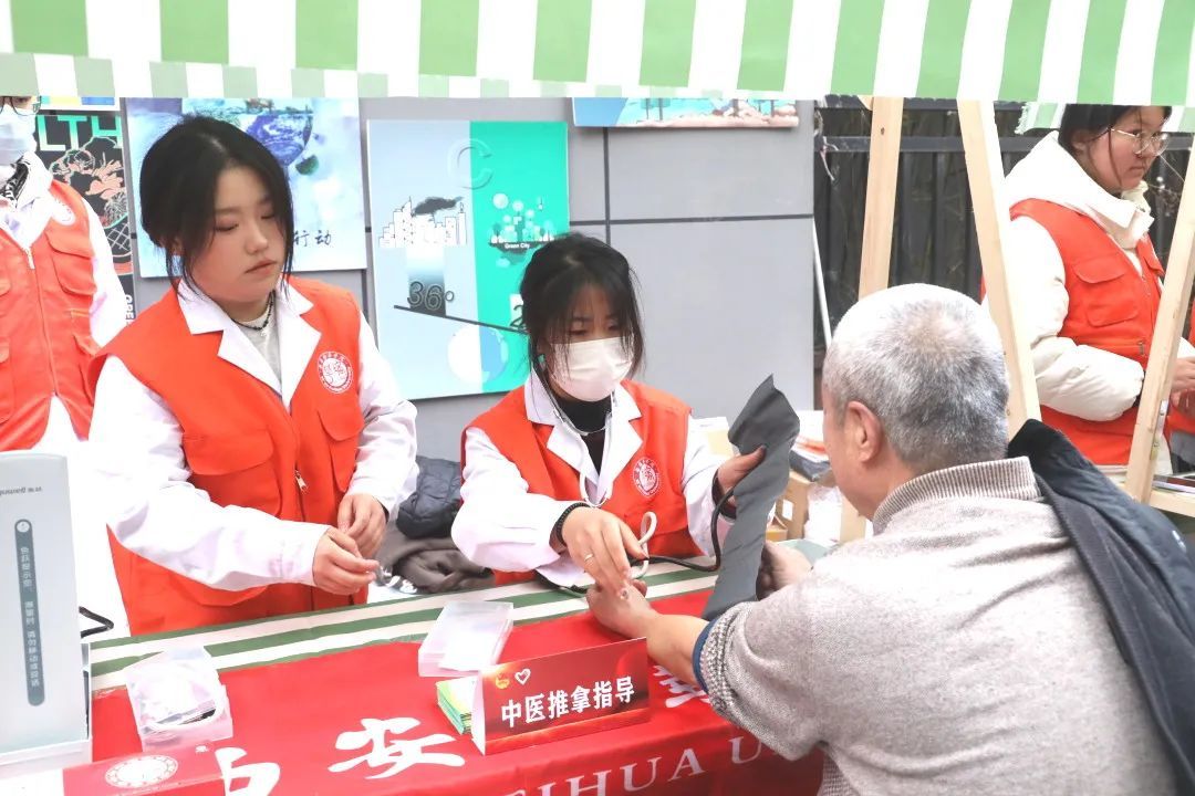 义诊现场,医学院的同学们开展了测量血压、健康咨询、推拿、刮痧等中医诊疗活动,为弘扬和传播中医文化做出了积极贡献。