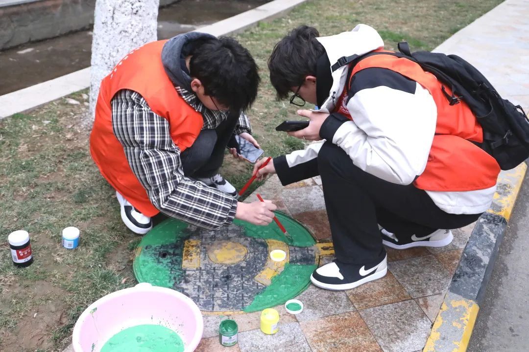 传媒与设计学院的志愿者们提前准备好了绘井盖所需的颜料、画笔等工具,精心挑选了色彩明丽、充满童趣的卡通形象作为样板。创作过程中他们相互协作、相互学习。
