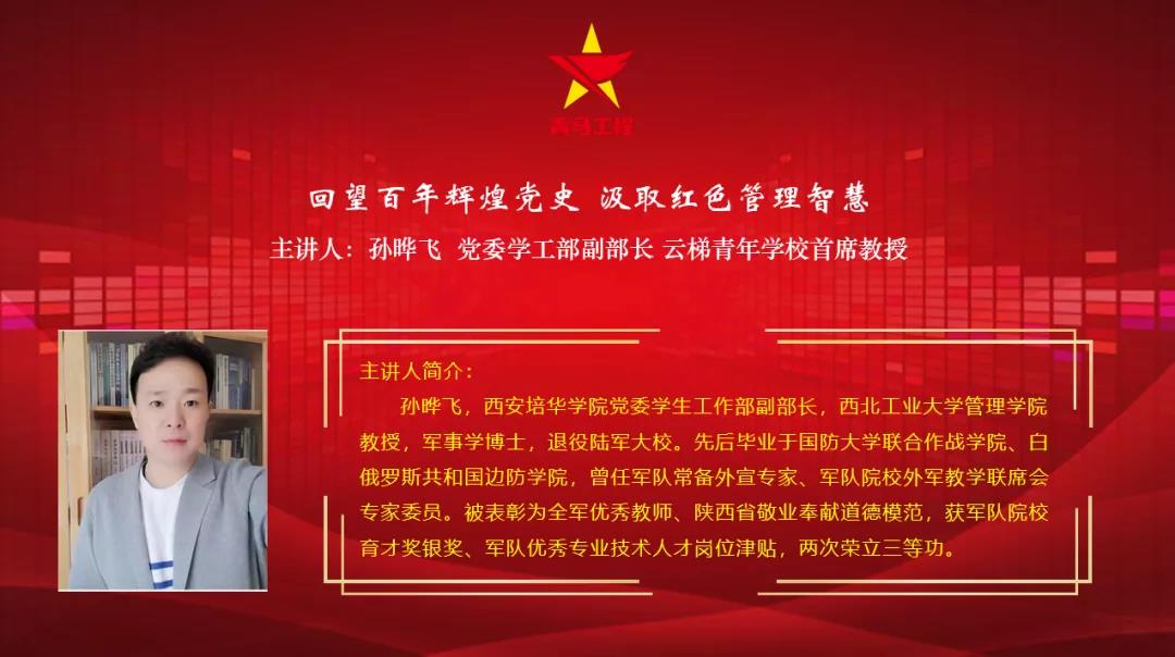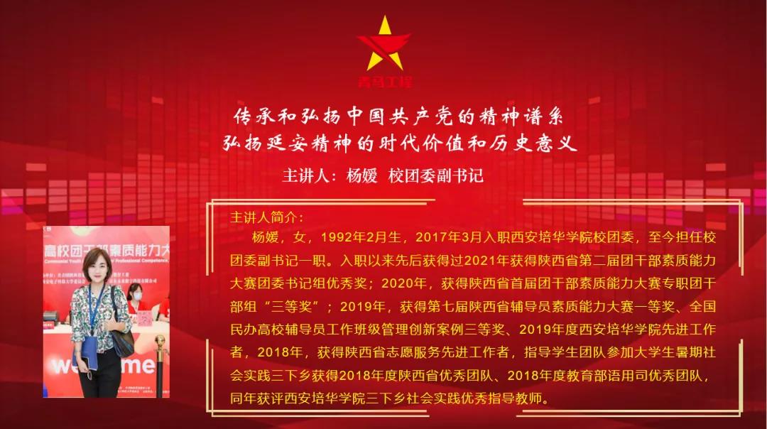 为了进一步推进青马工程培训班的展开,促进团学骨干更深入的明确自身职责,勇担时代使命,共青团西安培华学院委员云梯青年学校于2021年11月23日19点在恒友楼报告厅召开第十五期青马工程第二讲。党委学工部副部长、云梯青年学校首席教授孙晔飞,校团委副书记、校学生会秘书长杨媛老师应邀担任本次培训的主讲人。