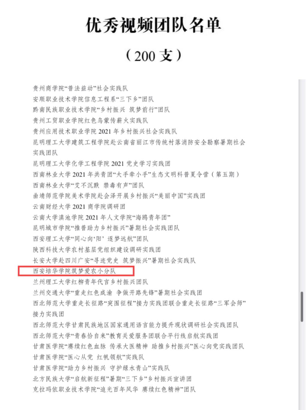 ▲西安培华学院团委荣获2021年“镜头中的三下乡”