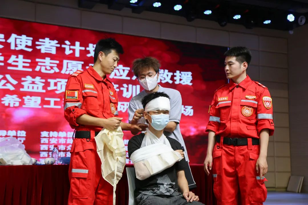 防灾减灾教官、西安市绿世界环境宣传教育发展中心负责人张芝科一丝不苟地进行示范指导和教科书式的技能展示,从实践上指导学生学习包扎等应急救援知识,更大程度增强志愿者的实训能力。