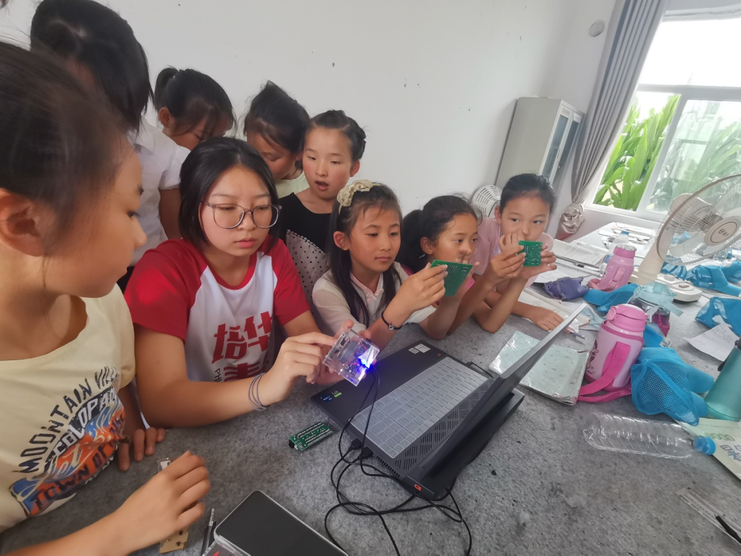 7月11日上午,智能学院的支教老师利用专业学科知识为孩子们开展电子知识普及小课堂,其包括物联网时钟、智能小车和自制音响等科技产品,引起了孩子们的注意,他们纷纷围上前来,脸上充满了疑惑,他们认真的听老师讲解自制的智能小车和充满神秘色彩的物联网时钟,从车轮到安装到电路板的组合再到小车的主控制器,同学们看到小车在自己操控的动起来的那一瞬间,都开心的笑了起来,还有炫酷的物联网时钟,同学们只要轻轻的按一下开关,屏幕上就会显示出网络同步时钟并带有多样的颜色。第一次在课堂上看到这些科技产品,孩子们目光鉴定的说道:“我们以后也要当一个会发明各种新产品的科研人员,为国家的发展奉献出自己的力量!”孩子们说得铿锵有力,志愿者们也为他们伟大的理想而鼓掌,也相信他们终将会通过自己的努力,走出大山,到达理想的彼岸,为祖国的繁荣发展贡献出自己的一份力量,为中华之崛起而读书!