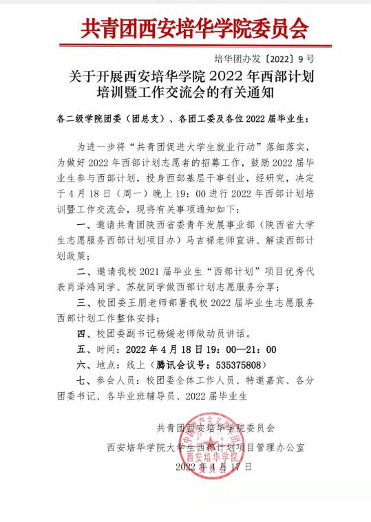 为认真贯彻落实共青团中央关于西部计划项目深化改革、全面提升管理水平的若干要求和全国项目办《关于做好2022-2023年度西部计划志愿者招募派遣工作的通知》、省项目办《关于2022-2023年度陕西省西部计划志愿者招募选拔工作的通知》文件精神,聚焦“为党育人、为国育才”的总体目标,紧扣西部计划项目的实践育人属性和人才跨区域流动功能,有效发挥我省高教资源优势,动员招募我校优秀大学毕业生投身西部基层岗位成长成才。根据工作部署,我校先后开展了西部计划志愿者招募心理测评、笔试和面试工作。