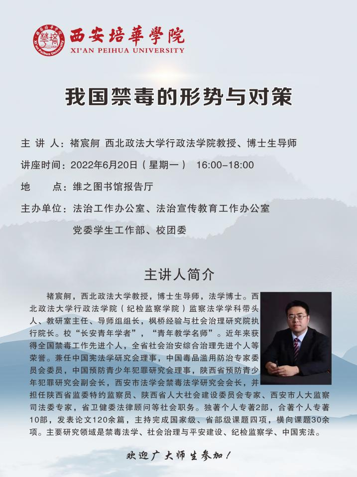 在第35个“6.26”国际禁毒日到来之际,为进一步加强学校禁毒宣传教育工作力度,增强全体师生自我防护意识,提高广大师生识毒、防毒、拒毒和辨毒能力,促进校园和谐稳定发展。2022年6月20日下午16:00—17:30,西北政法大学博士生导师褚宸舸教授受邀在维之图书馆报告厅以“我国的禁毒形势与对策”为题做专题讲座。本次讲座由法治办公室、法治宣传办公室、党委学生工作部、校团委主办,线上+线下共计500余人参与,讲座由校团委书记杨媛主持。