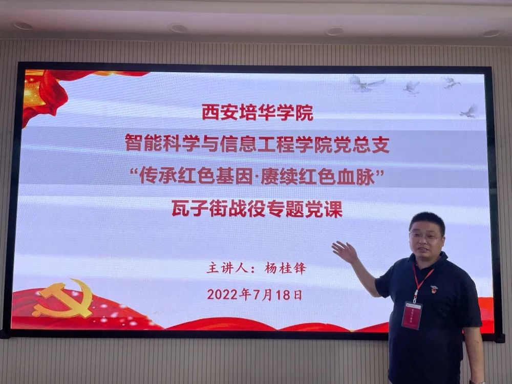 智小达团队一行,在瓦子街战役烈士纪念馆演播厅观看瓦子街战役记实,并由团队指导老师、西安培华学院智能科学与信息工程学院党总支学支部书记——杨桂锋,根据参观、瞻仰情况上了一堂生动的专题党课。