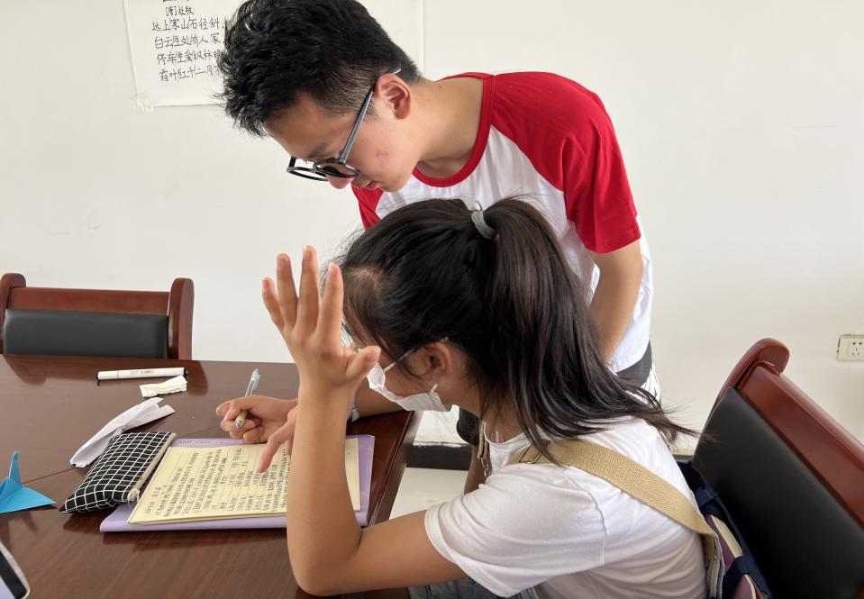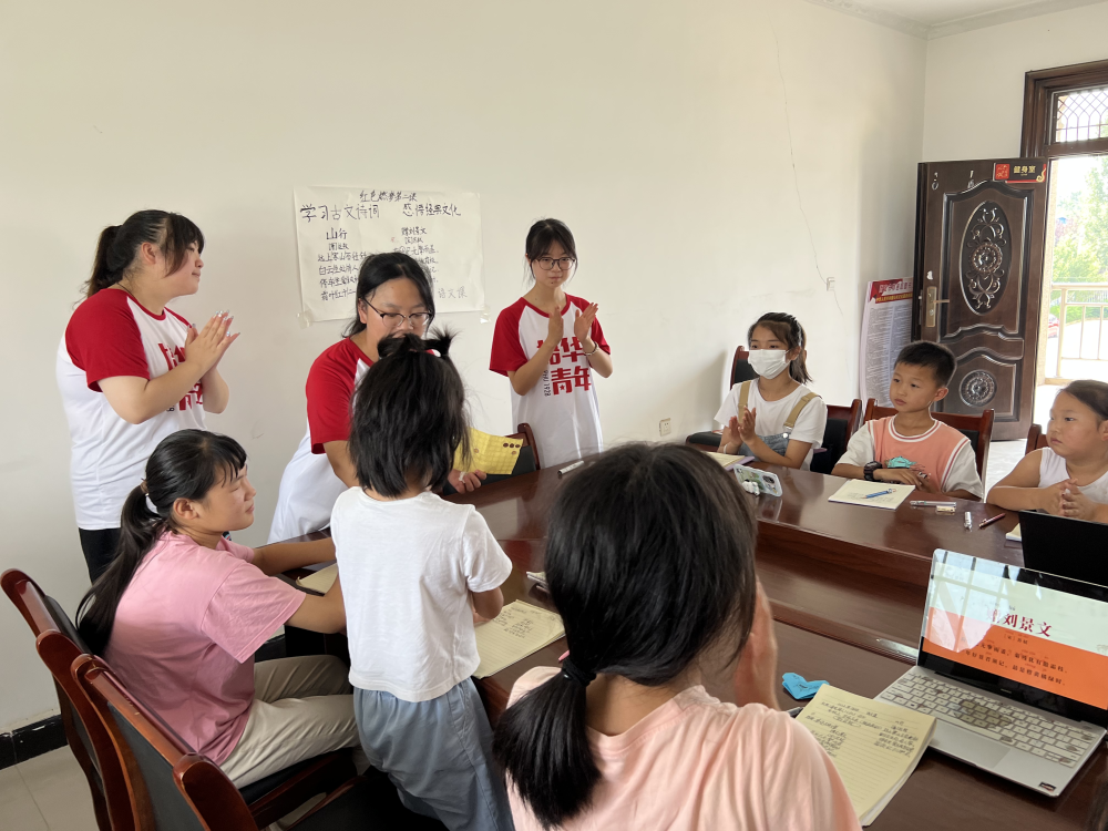 为传承文化经典,提高当地中小学生国学素养,实践队队员决定开设品味经典诗词课程。课堂上,实践队队员带领小朋友们学习《山行》和《赠刘景文》两篇诗词。实践队队员通过诗词解析细致讲解,将诗词内容娓娓道来,深入人心。小朋友们凭借对诗词的深刻理解、以高亢嘹亮的声线齐声诵读,进一步加深了对经典诗词的兴趣以及浓厚氛围。