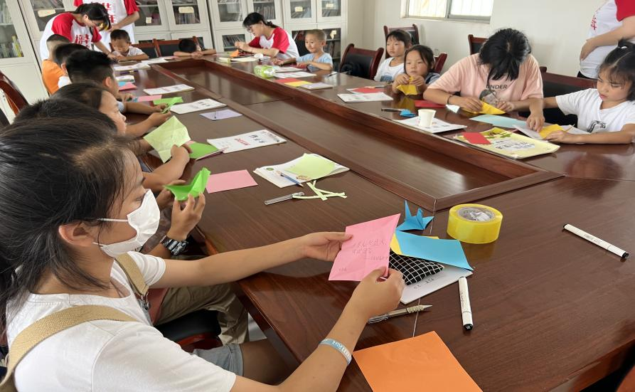 此次课程中有多彩美工课程深受孩子们喜欢,小朋友们享受自己动手的乐趣,成功的喜悦,收获的开心。课堂上实践队队员们细心教导小朋友们折纸,耐心指导,共同为小朋友们创造出属于自己的专属手工。