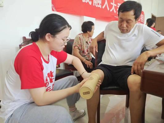 医心护梦社会实践队于7月15日在池阳村党群服务中心开展主题为“义诊惠民生,医疗送健康”的定点义诊活动,旨在缓解村民身心的不适感,向他们普及相关基础健康知识。活动内容包括基础问诊、测量血压、按摩、针灸、艾灸等,不少村民都表示队员们的手法很好,经过按摩或艾灸之后全身都轻松很多,大大缓解了疲惫感,并对队员们表示感谢和鼓励,同时也表达了殷切的希望。