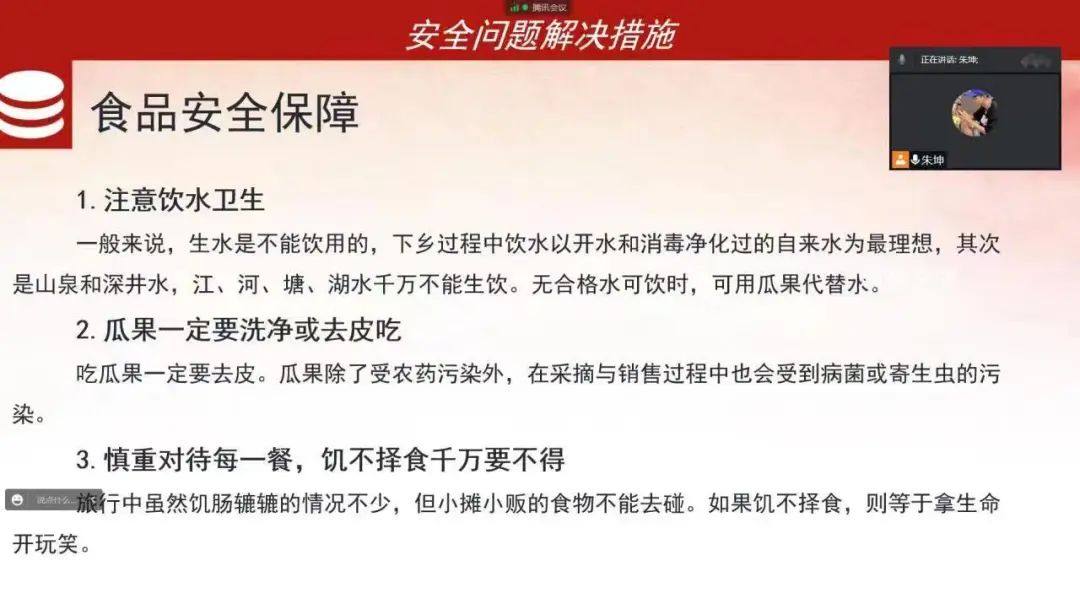 8月6日晚,团队进行线上安全培训,团队安全负责人主要从“安全的重要性”“活动中的安全问题”, “安全问题解决措施”三个方面开展培训,着重提到了食品安全和人员安全。