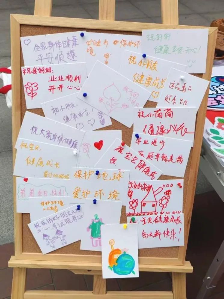 宣讲结束后,社区广场的“心愿墙”成了拍照打卡点。实践队拿出一张张装饰纸让居民们写下祝福与心愿,使得整个板面被装饰得如同盛开的花一般灿烂。 7岁的康康斩钉截铁的写出了保护地球,爱护环境这句话;8岁的朵朵认真的画出来蓝天白云,房子和花草更有居民主动提议:“把心愿墙留着吧,每周来看看有没有实现!”