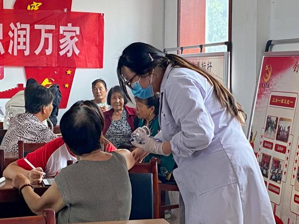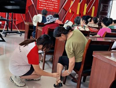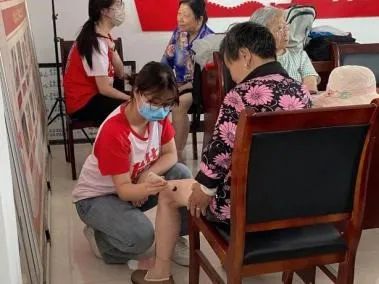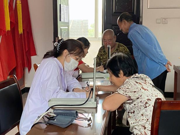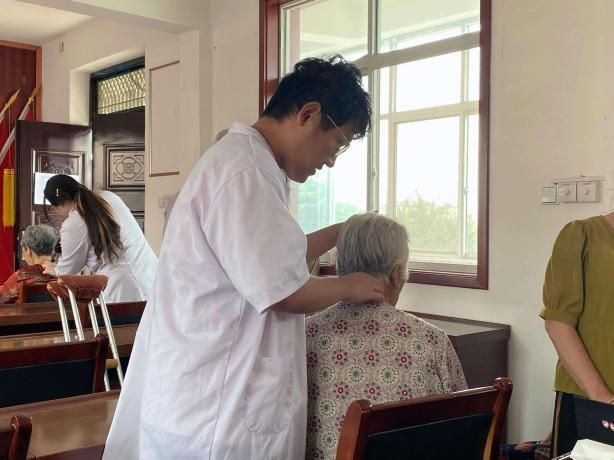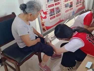 知识宣讲结束后,队员有序为村民开展个性化健康服务,为村民测血压、记录数据、询问病史、用药及症状,建立简易健康档案。依据健康评估结果,团队按“一人一策”原则分批次开展中医理疗。其中,针对高血压患者,用平肝潜阳推拿手法按揉太冲穴;为高血脂人群实施拔罐疗法,刺激脾俞、胃俞等穴位;针对关节疼痛村民,用艾灸疗法作用于足三里、阴陵泉等穴位疏通经络气血。