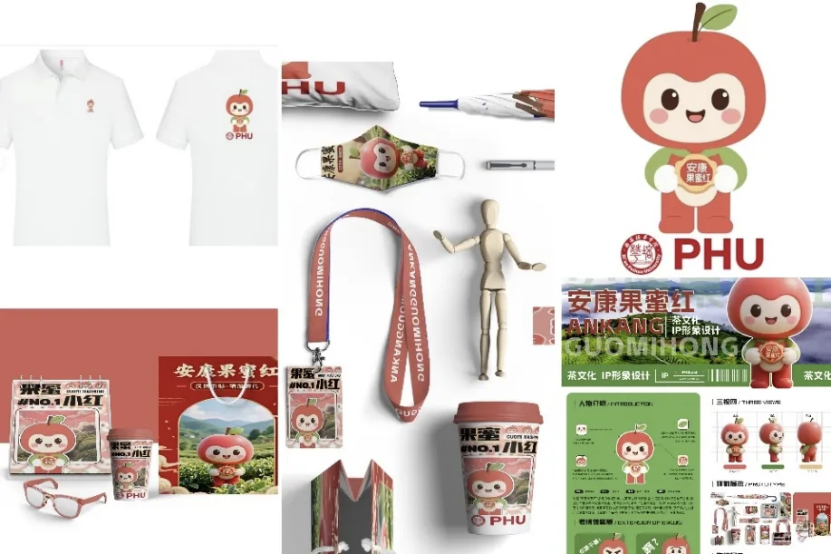 在深入调研安康果蜜红茶产业现状后,为破解产品同质化困境,西安培华学院实践团队充分发挥数字媒体艺术专业优势,为“安康果蜜红”品牌创新设计虚拟IP形象及系列文创衍生品。该IP以红苹果为核心造型,融合动态绿叶元素,生动传递“生态富硒·可持续发展”品牌理念。设计成果涵盖联名款T恤、文创抱枕、主题马克杯、定制钥匙扣等产品,巧妙融入西安培华学院校徽元素。