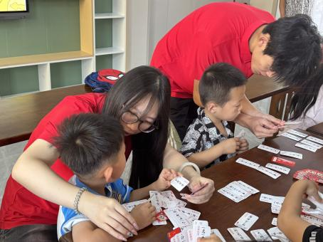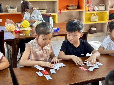 课堂知识随即融入“成语接龙纸牌”创意游戏,孩子们手持队员们精心设计的特色纸牌,或凝神思索,或欢快接续。方寸卡牌间,成语如珠链流转,将游戏融入教学,既巩固所学,更极大激发了孩子们对汉语词汇之美的感知与探索热情,笑语充盈活动现场。