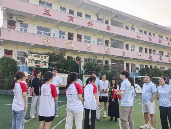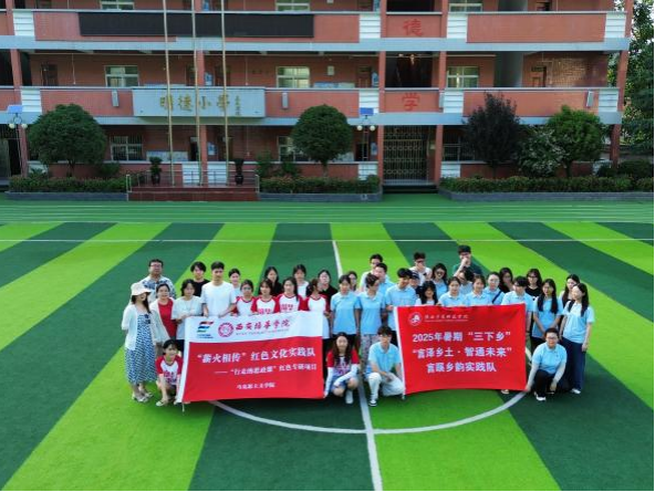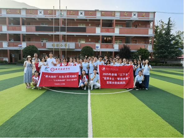 红脉燃情传古韵,言泽润土谱新声。西安培华学院“薪火相传”红色文化实践队与陕西学前师范学院“言泽乡土”实践队在茅坪回族镇中心小学的操场上不期而遇。一支身着红白队服,怀揣着老区红色故事与革命先辈的峥嵘记忆;另一支则以靛蓝为底,携着普通话推广教材与乡音调研问卷。当红色故事里的家国情怀遇上普通话里的文化纽带,当历史记忆的火种遇见语言传承的星辉,这场三下乡的偶遇,让青春的脚步在乡野间踏出更响亮的回响。