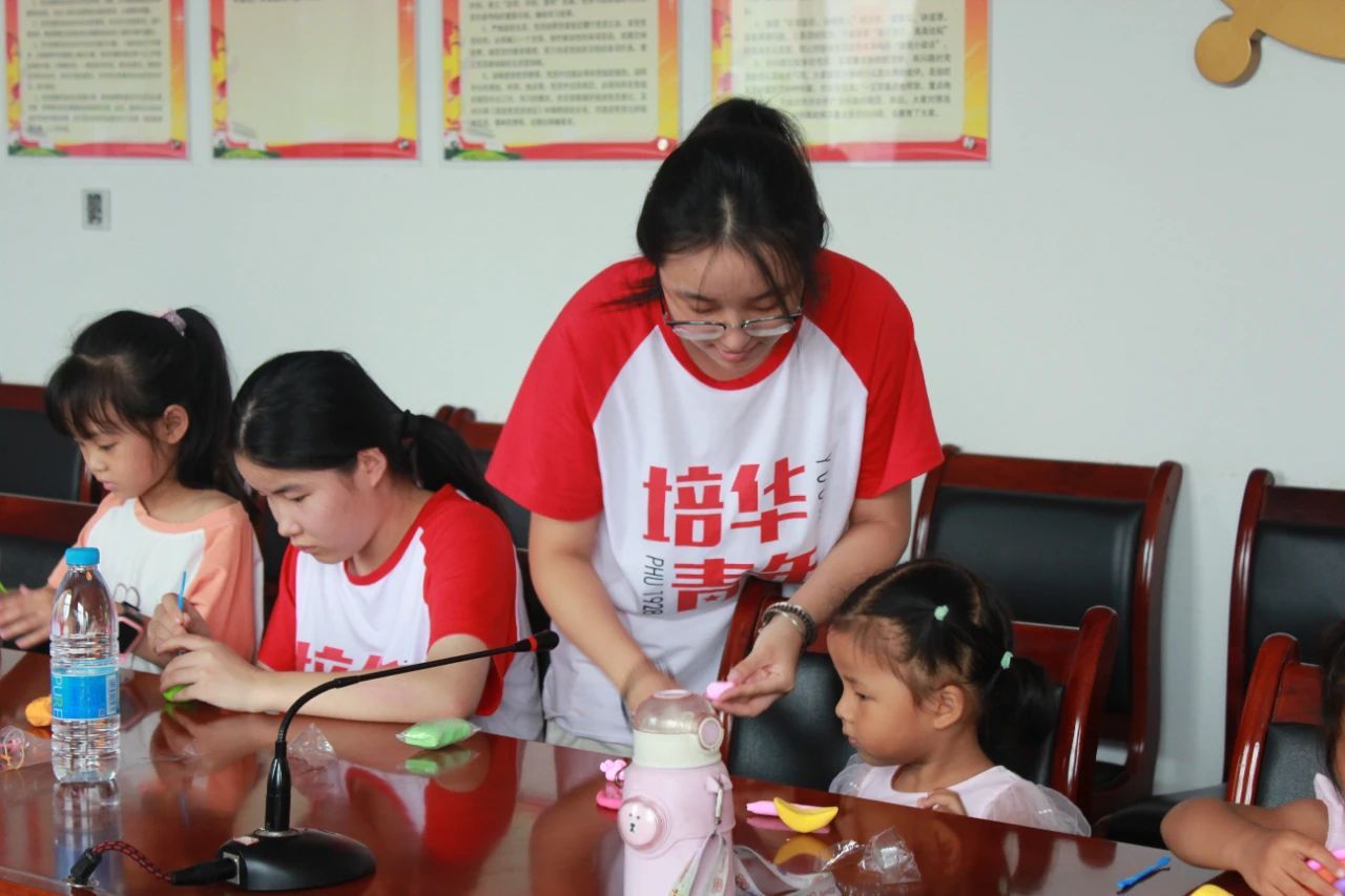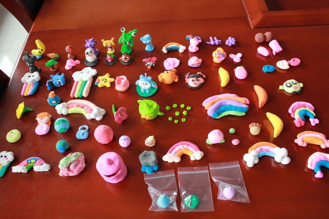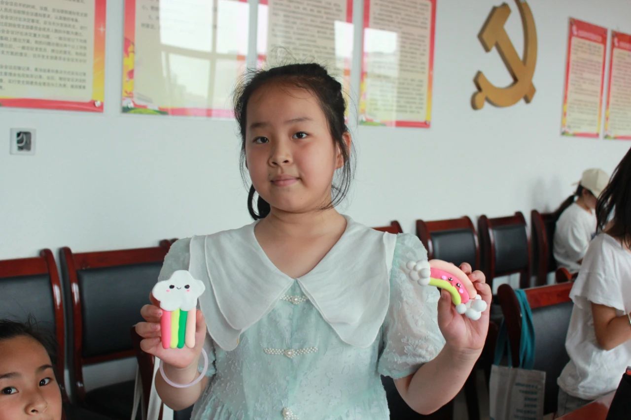 志愿者们将普通话词汇学习融入手工制作当中,手工桌成了语言学习的魔法台,孩子们用指尖将抽象词汇捏成可触的形状。当黏土化作“月亮”时,“yueliang”的发音便有了光;当彩纸剪成“彩虹”时,“caihong”的拼读便有了色彩,一揉一捏中渗透进童年时光。有些小朋友想象力丰富,作品天马行空,他们向志愿者讲述每个作品蕴藏的故事,有些小朋友结合当下热点,捏出来了哪吒、蛋仔这些他们喜欢的事物。志愿者们相信,当语言教育与艺术熏陶相结合,孩子们的成长之路必将更加绚丽多彩。