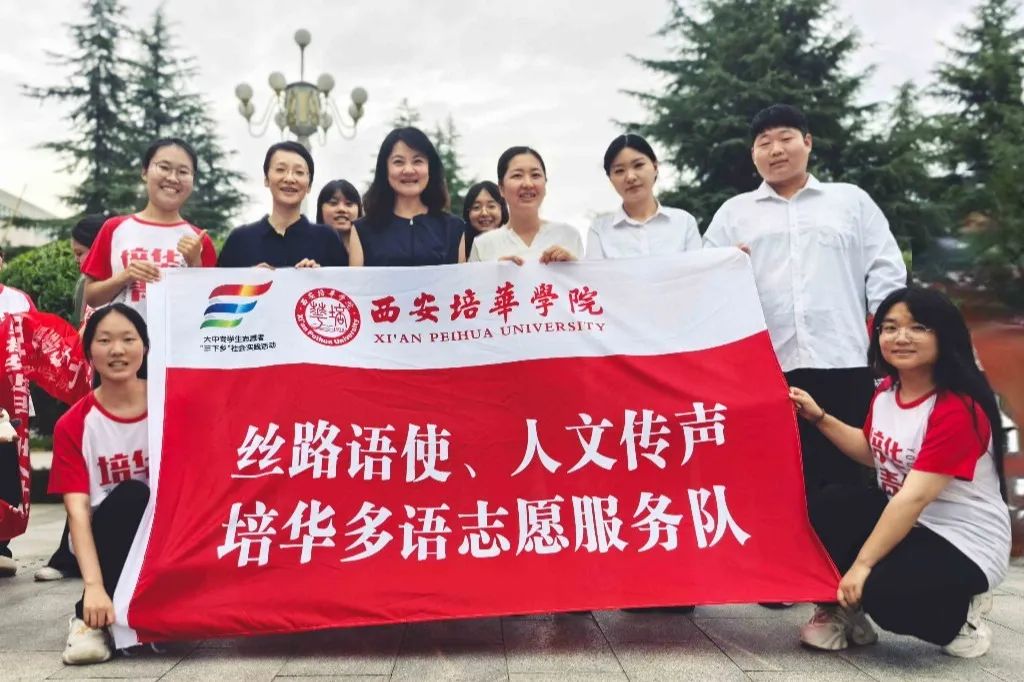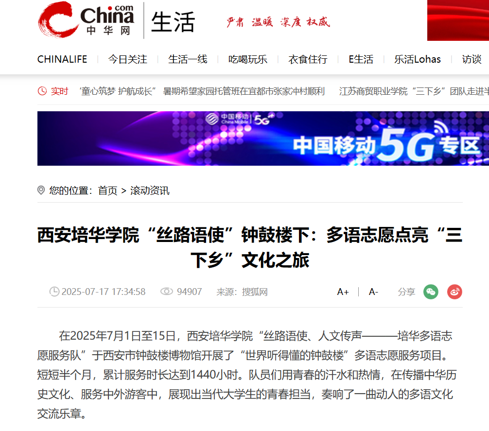 在2025年7月1日至15日,西安培华学院“丝路语使、人文传声———培华多语志愿服务队”于西安市钟鼓楼博物馆开展了“世界听得懂的钟鼓楼”多语志愿服务项目。短短半个月,累计服务时长达到1440小时。队员们用青春的汗水和热情,在传播中华历史文化、服务中外游客中,展现出当代大学生的青春担当,奏响了一曲动人的多语文化交流乐章。