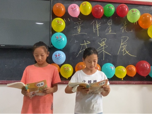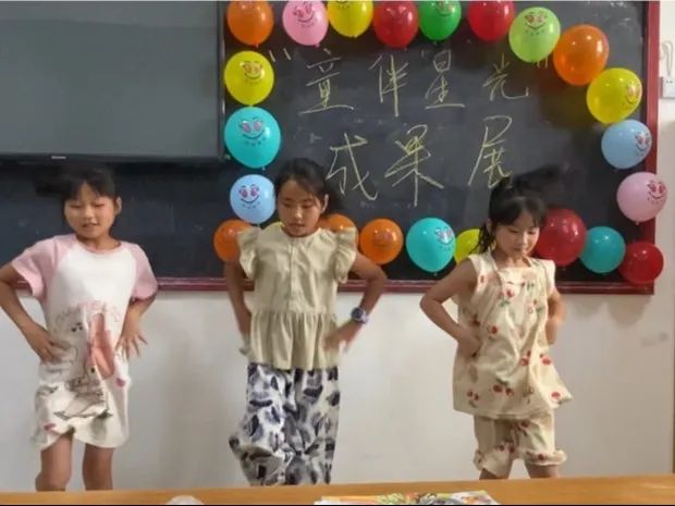 十日时光接近尾声,一场名为 “童伴星光成果展” 的文艺汇演,成了最好的总结。教室里,彩色气球串起了孩子们的期待,也系着队员们的不舍。两个女孩起初怯生生地念诗,声音却渐渐清亮,字里行间满是对田野与星空的想象;三个女孩跳着自编的舞蹈,每一个动作都透着对热爱的执着;最后一首合唱,从紧张的起调到众人和声,笑声与歌声交织成最动人的旋律。
