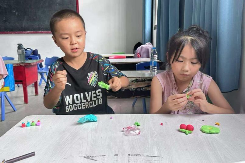 “老师,你看我的小花会‘开花’!” 在粘土创作课上,一个小男孩举着自己捏的 “会变形” 的粘土花雀跃地喊道。这堂课以 “自然与生活” 为主题,队员们没有设定标准答案,而是鼓励孩子们自由发挥。有的孩子还原了村口的老槐树,有的孩子捏出了和伙伴们玩耍的场景,还有的孩子用五彩粘土做了 “会飞的房子”。当孩子们为了 “搭建一个村庄” 而自发分工合作时,队员们真切感受到:创造力从不是刻意培养的,只要给足空间,它就会自然生长。