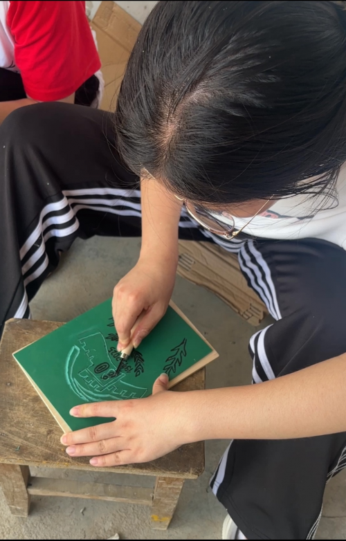 在非遗探寻之旅中,“木版烽火小分队”的队员们不仅深入学习木版年画的技艺,更通过亲身实践,将传统非遗与红色文化紧密融合。在临时搭建的沉浸式工作坊里,队员们拿起刻刀,小心翼翼地在木板上雕刻出精美的图案。他们从简单的线条开始,逐步掌握雕刻的力度与技巧,体验传统技艺的艰辛与乐趣。在实践中,队员们将红色文化元素融入创作,用刻刀记录历史,用年画传承精神。一幅幅亲手制作的年画作品,不仅展现了队员们的学习成果,更体现了新时代青年对非遗文化的传承与创新。