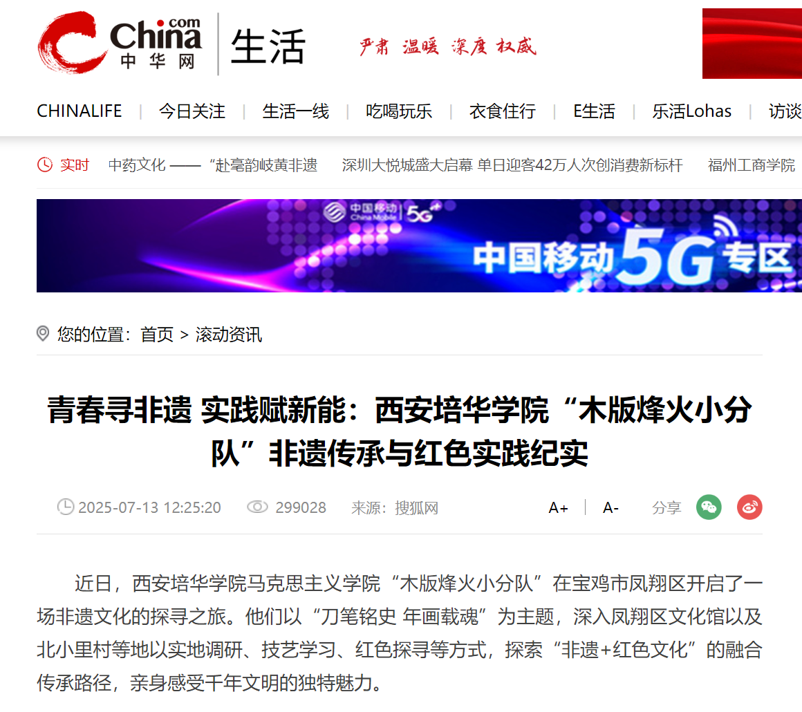近日,西安培华学院马克思主义学院“木版烽火小分队”在宝鸡市凤翔区开启了一场非遗文化的探寻之旅。他们以“刀笔铭史 年画载魂”为主题,深入凤翔区文化馆以及北小里村等地以实地调研、技艺学习、红色探寻等方式,探索“非遗+红色文化”的融合传承路径,亲身感受千年文明的独特魅力。