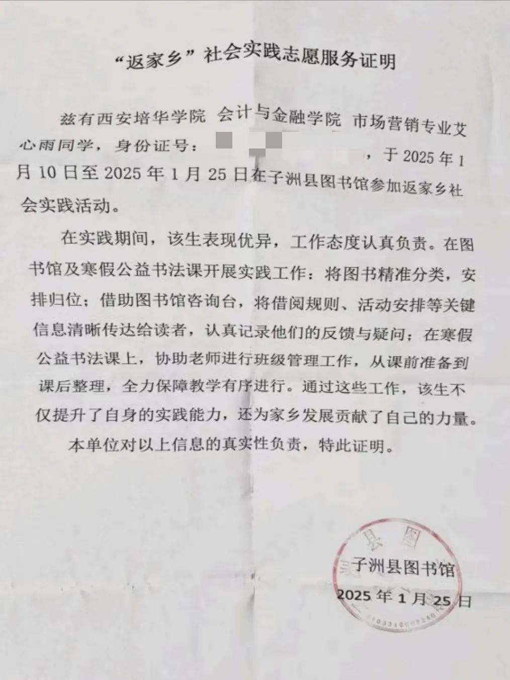 为响应时代号召,西安培华学院团委积极组织“返家乡”社会实践活动,为2025年寒假大学生打造实践平台。帮助引导学生树牢理想信念、提高社会化能力,激发投身基层、服务家乡的深厚情怀,推动共青团实践育人工作深度融入高校“大思政课”建设。