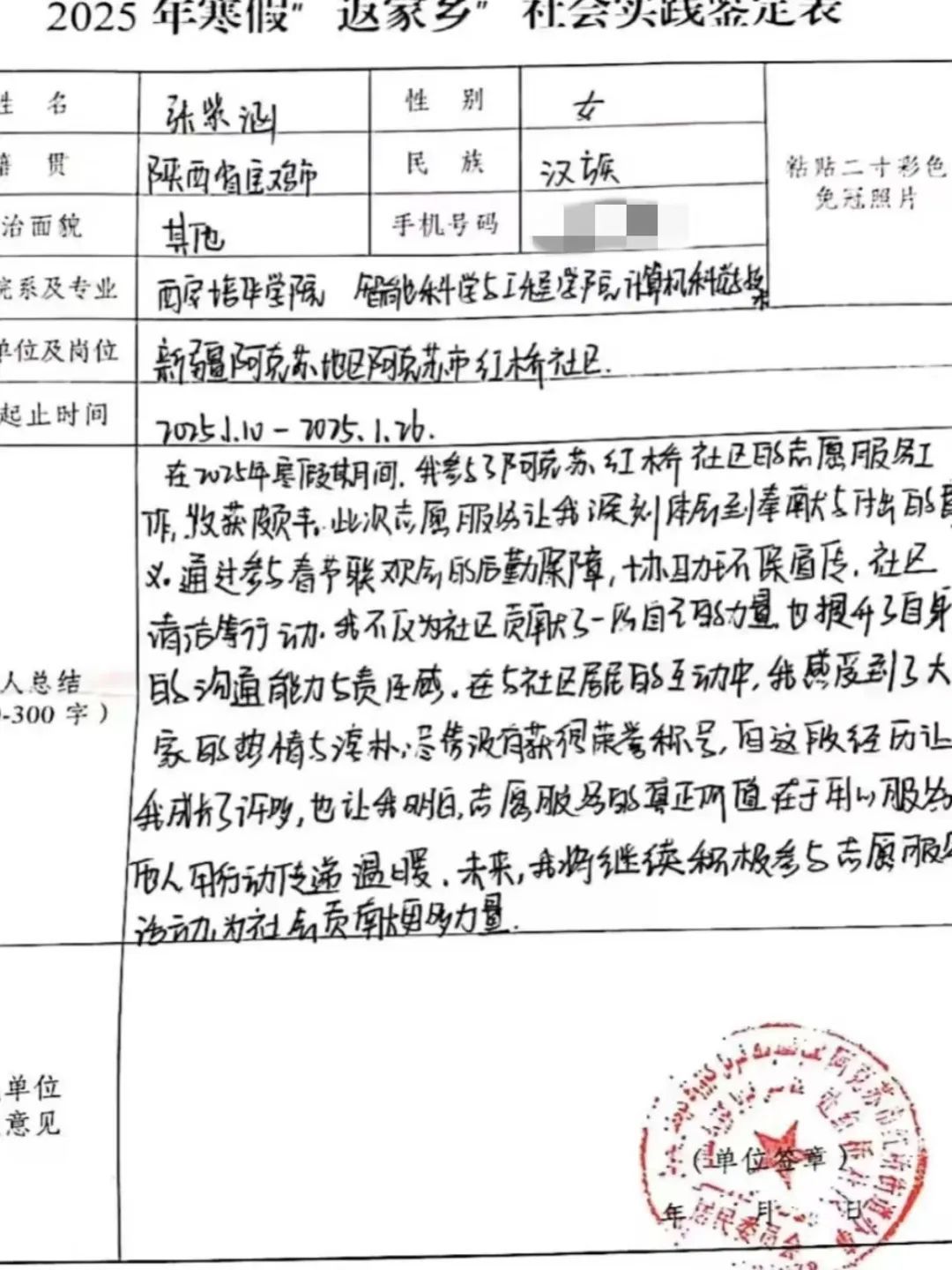 在新疆阿克苏红桥社区扎扎实实当了回“多面手”——守大门、扫街道、搞宣传、看村晚,105个小时的志愿服务,干的都是些“小事”,但攒了一肚子实在体会。零事故的门岗、焕然一新的卫生死角、发到居民手里的法律手册,还有村晚后台那些欢声笑语,让我摸到了基层服务的门道,也把新疆的多元文化刻进了心里。
