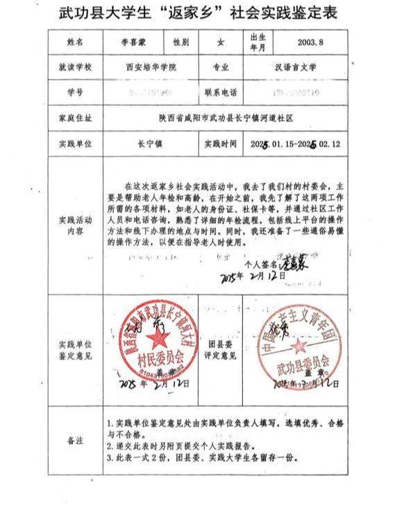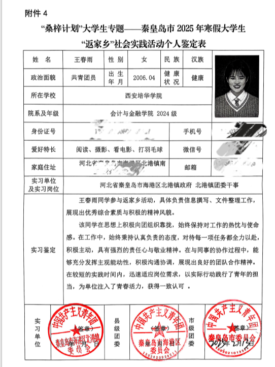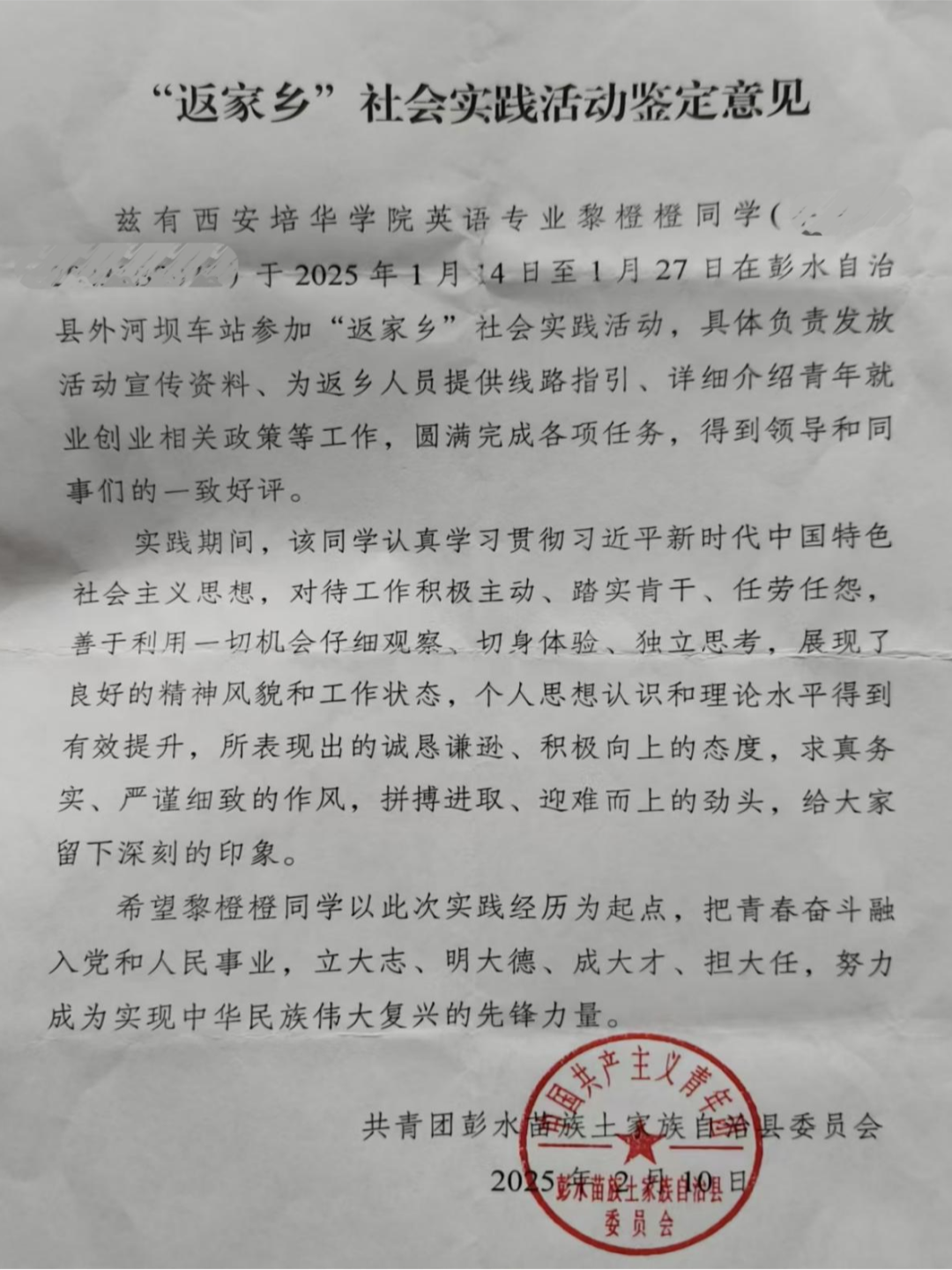 为响应时代号召,西安培华学院团委积极组织“返家乡”社会实践活动,为2025年寒假大学生打造实践平台。帮助引导学生树牢理想信念、提高社会化能力,激发投身基层、服务家乡的深厚情怀,推动共青团实践育人工作深度融入高校“大思政课”建设。