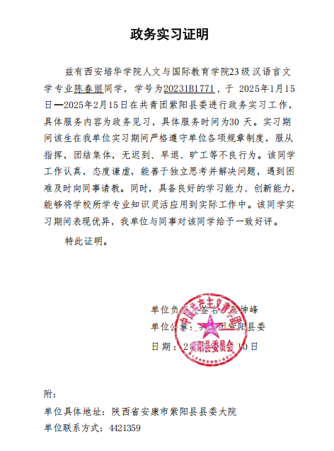 协助组织各类青年活动、整理团委文件、撰写报告以及运营公众号等工作。参与紫阳县“童伴小课堂”活动,对接返家乡大学生的社会实践工作,确保实践活动顺利开展。此外,还组织并参与了2025年冬季“暖冬行动”,活动取得了良好的社会反响。在日常工作中,协助整理共青团紫阳县委的资料,并与同事紧密配合,确保各项任务有序推进。通过这段实习经历,我不仅深入了解了团委在引导和服务青年方面的作用,也更加认识到团委工作的重要性和责任感。